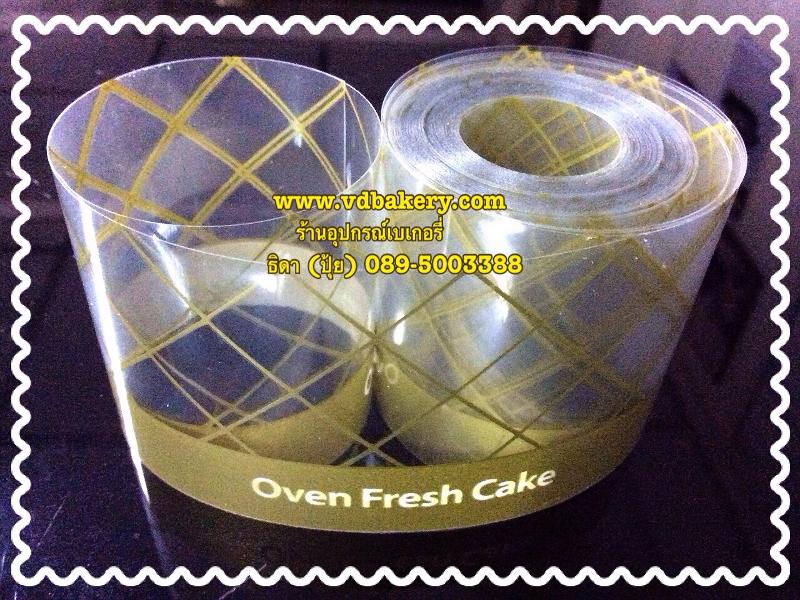 พลาสติกหนา ความสูง 2 นิ้ว ลายสก๊อตสีทอง พื้นใส สกรีน Oven Fresh Cake สำหรับพันรอบเค้กให้สวยงามมากยิ่งขึ้น (สินค้านำเข้าจาก เกาหลี)